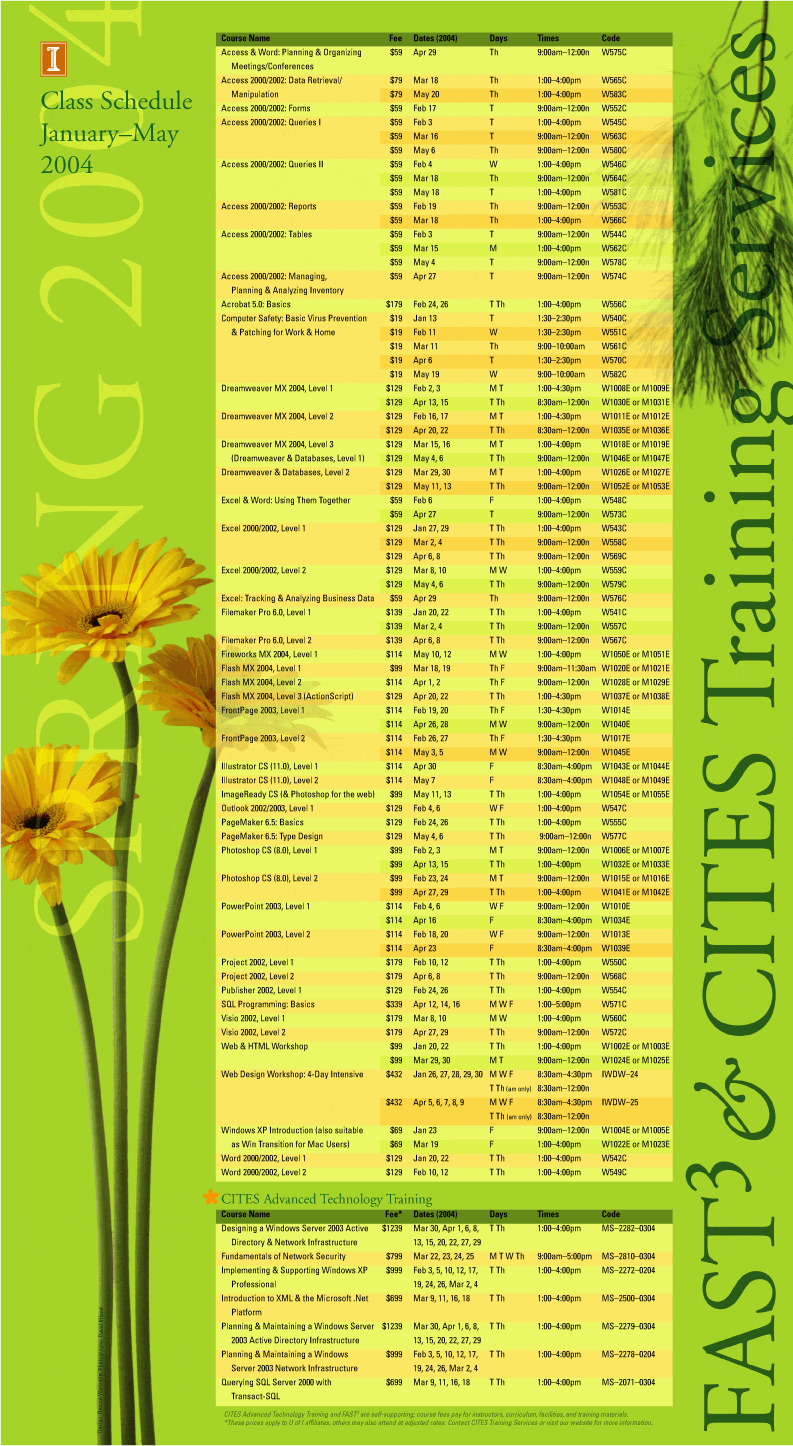 < Back to Graphic Design. Mailer with spring 2004 Training Schedule, outside panel and unfolded inside page. (Photography by David Iffland)