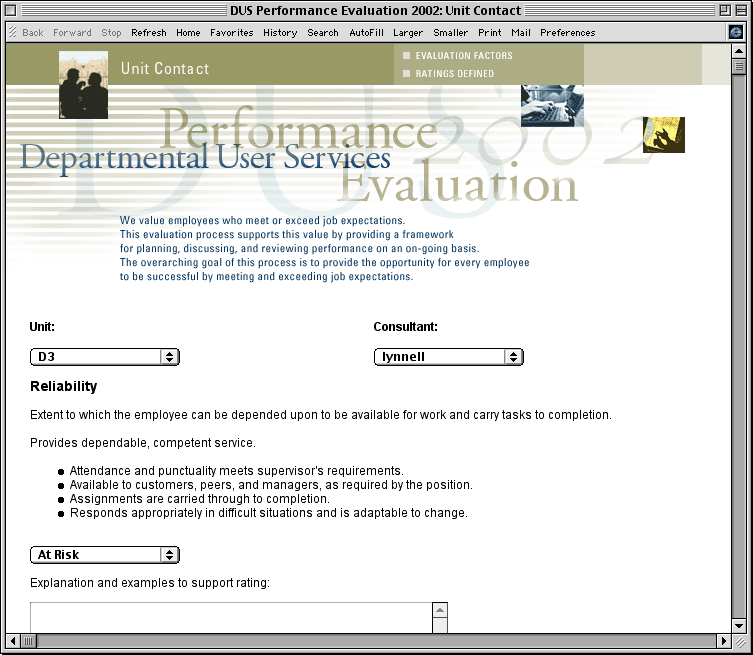 Screen shot of 2002 DUS Performance Evaluation page.