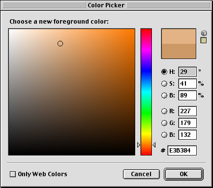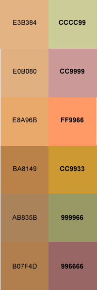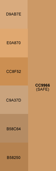 Although I'm no longer strict about using web-safe colors when spec'ing html hex codes, I try to ensure that the colors I use will not shift to objectionable colors on low-res monitors. (For more about web colors, also see a list of hex codes, a list of basic color names, and Joe Burn's explanation of hex codes.) The Color Picker in Adobe ImageReady warns web authors that a color is not web safe, and it shows how a web-safe color might shift to a non-web-safe color. In the screenshot on the right, a tan lighter than the web-safe #CC9966 is desired (the web-safe color is at the bottom of the box on the top right of the screenshot). However, the particular tan that the cursor is over will shift to web-safe green #CCCC99, as indicated by the warning on the far top right. To demonstrate how low-res monitors might shift when rendering colors coded in HTML, I've used variations of tan as an example. Below are 4 sets of color bars. The 2 sets of color bars on the left are displayed using GIF images. However, the 2 sets of color bars on the right are hex codes in this page's HTML and are rendered by your machine. Theoretically, the coded colors on the right should look like the colors in the GIFs on the left. |